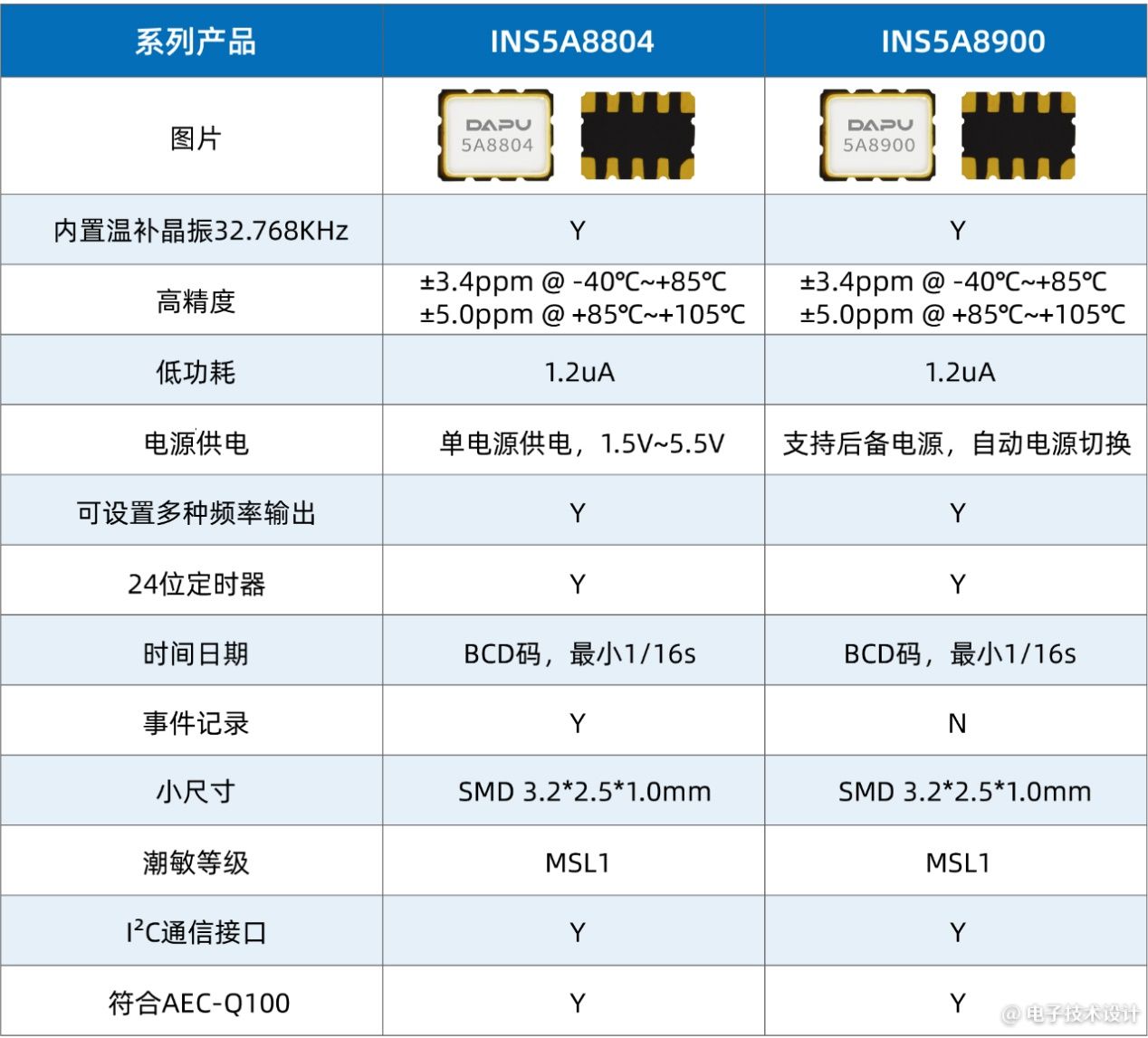 据悉,INS5A8900 & INS5A8804车规级RTC在芯片设计上极大限度地考虑了冗余和抗撞击特性,从而大大提升了产品性能指标,保证在恶劣环境下正常工作,具有高精度、低功耗、宽温区、小尺寸、高可靠性等特性。